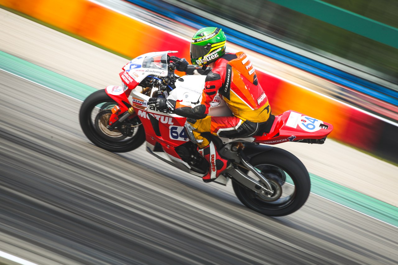 Так вот, использование MOTUL RBF660 Factory Line как ничто лучше справляется с интенсивным торможением, а следовательно уменьшает время прохождения круга. Стоит отметить, чем выше температура кипения тормозной жидкости, тем она гидроскопична, следовательно тормозную жидкость нужно менять не реже 1 раза в месяц, либо после каждой дождевой гонки.Использование смазки цепи, также является необходимостью. Motul Chain Lube FL показала себя с отличной стороны, как в плане защитных свойств, так и вплане сохранения мотоцикла в чистом виде, ведь многие другие смазки при движении начинают слетать с цепи, следовательно снижается защита, а также загрязняется мотоцикл.Ну и в продолжении чистоты мотоцикла следует отметить Motowash от MOTUL. Этим средством мы полностью покрываем необходимость в химии для очистки мотоцикла. Оно прекрасно очищает и колеса и пластиковые детали и лакокрасочное покрытие, также хорошо справляется со следами насекомых.