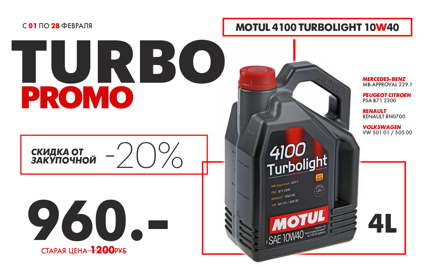 Весь февраль мы будем раскачивать ваши продажи самым бюджетным и народным продуктом Motul. Если ваш сегмент иномарки и отечественные 2000-х годов и старше, с пробегом более 200 000 км, то 4100 Turbolight 10w40 — это то, что им нужно.
